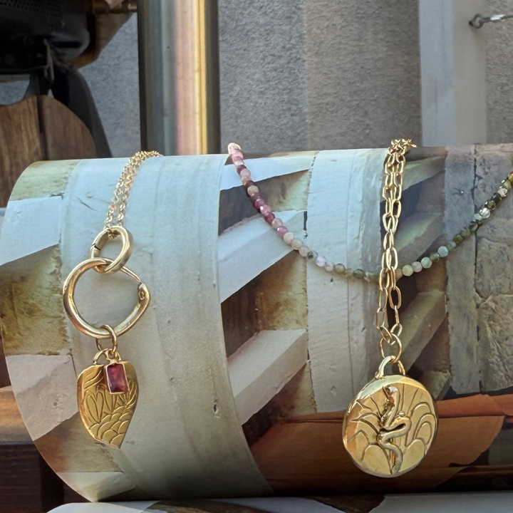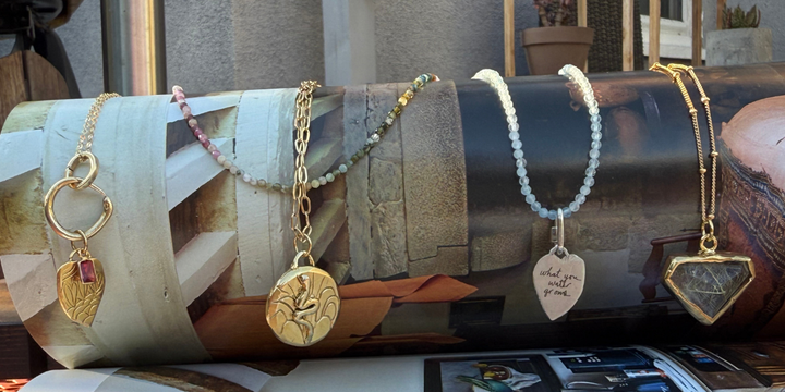 Begin with the foundation of your story—a strand of faceted gemstones or a chain of sterling silver or 14kt gold fill—then add a charm collector to hold what matters most. Adorn it with a pendant, an accent stone, or a hand-stamped quote to craft a necklace that carries your spirit and intention wherever you go.