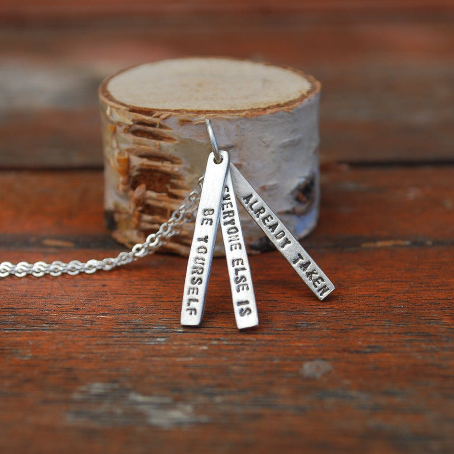This triple pendant necklace features an inspirational quote form Oscar Wilde. Each pendant measures 1/8" x 1". "Be yourself. Everyone else is already taken." Author, playwright and poet Oscar Wilde was a popular literary figure in late Victorian England. The meaning of this quote is pretty clear. Do not try to copy or imitate other people in the way they look, talk or behave, because no matter how hard you try, you will always be just a copy. The only way to be unique is to be yourself.