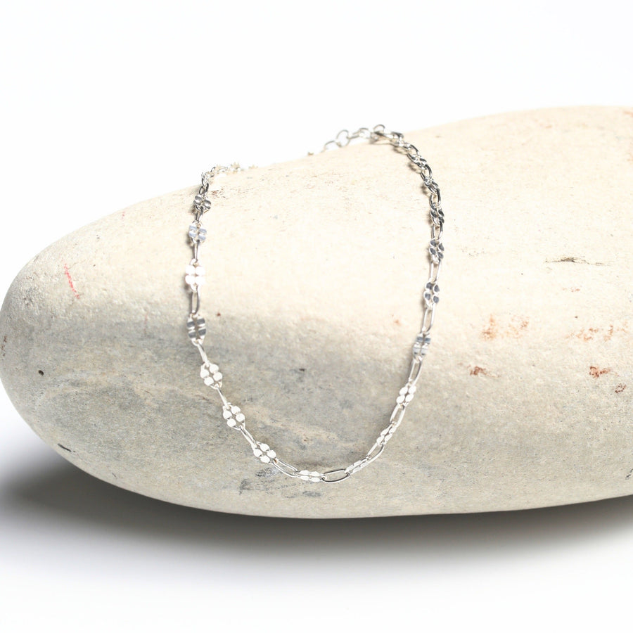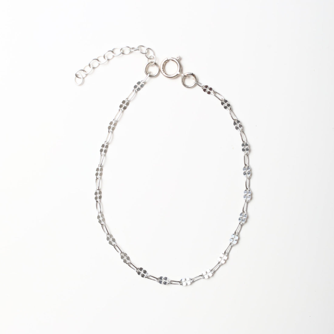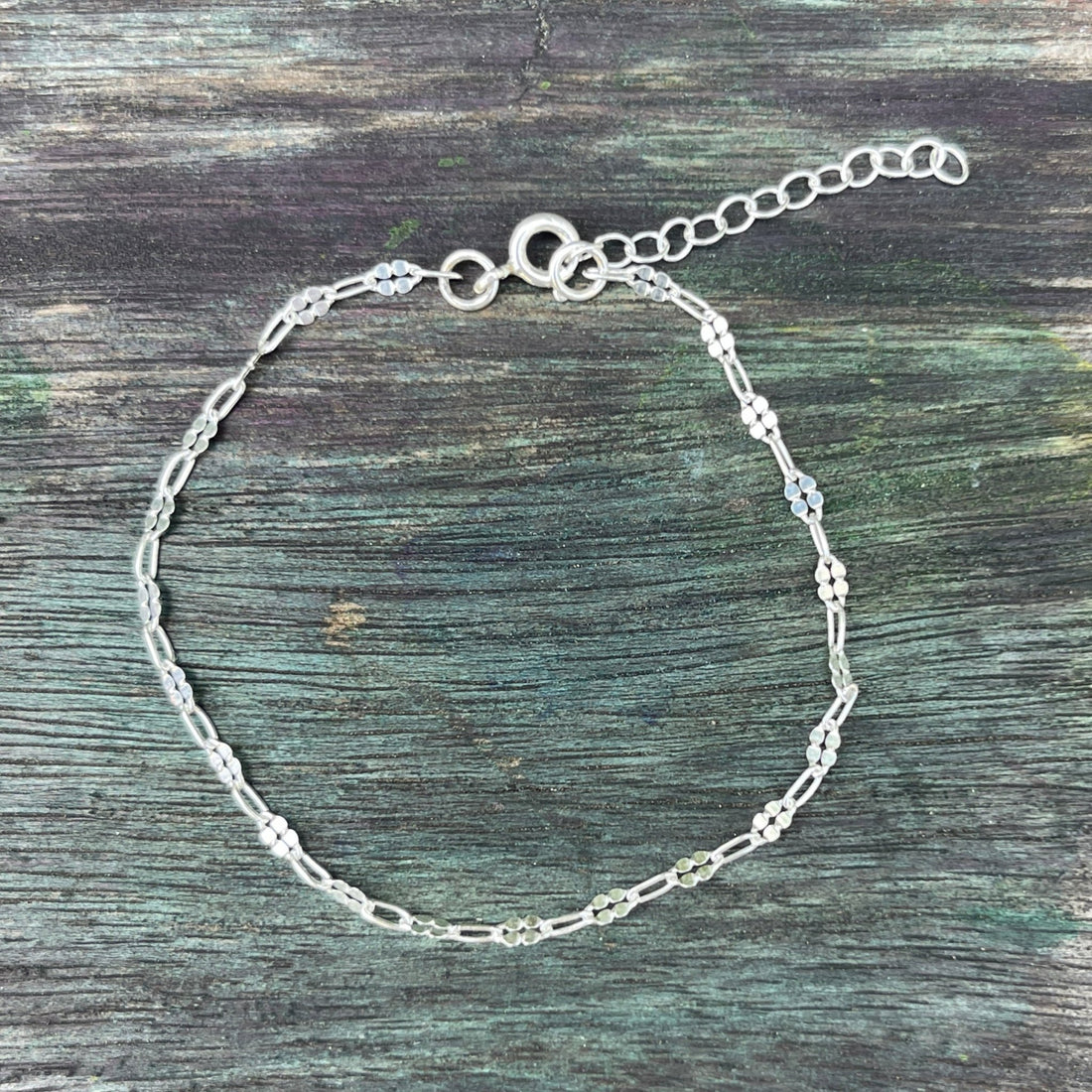 Simple, shimmery, and full of subtle detail, the Four Dot Chain Bracelet is crafted from sterling silver with flat-dapped links that reflect the light in a soft, four-dot pattern—like a little Morse code of sparkle on your wrist. Measuring 5 ¾” with a 1 ¼” extender, this piece is lightweight, comfortable, and endlessly easy to style. It’s the kind of bracelet that works with everything—from a plain white tee to a stack of mixed metals.