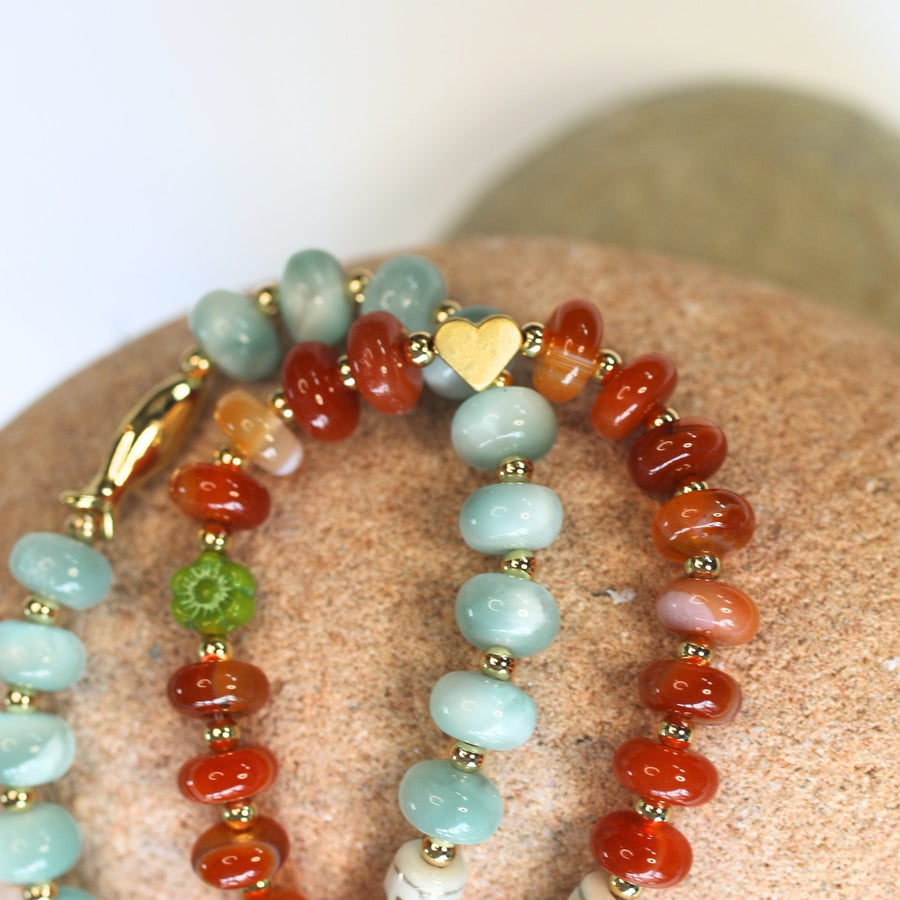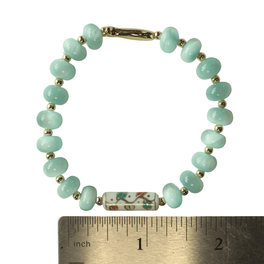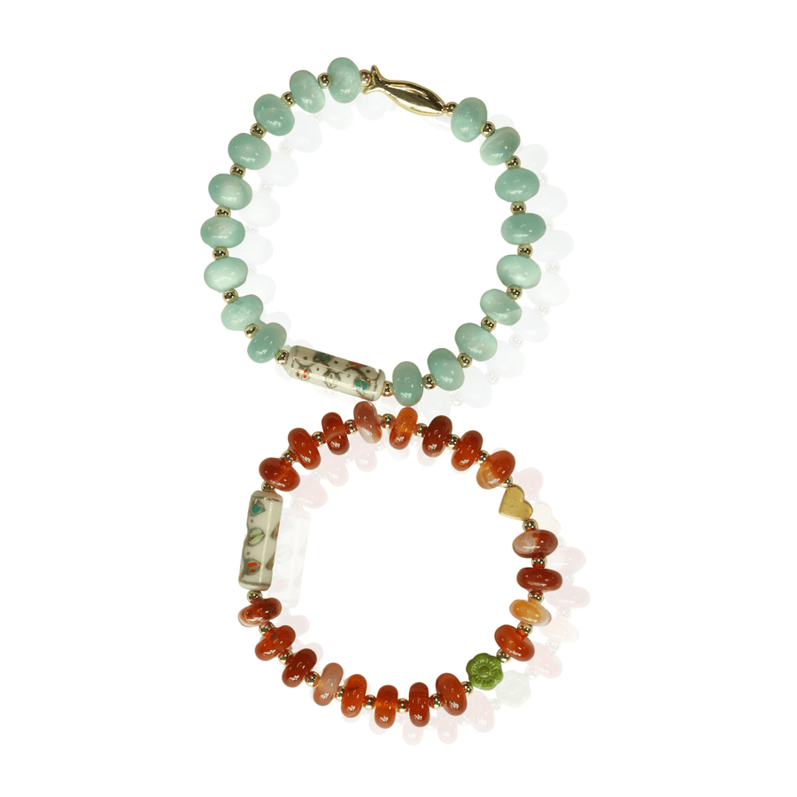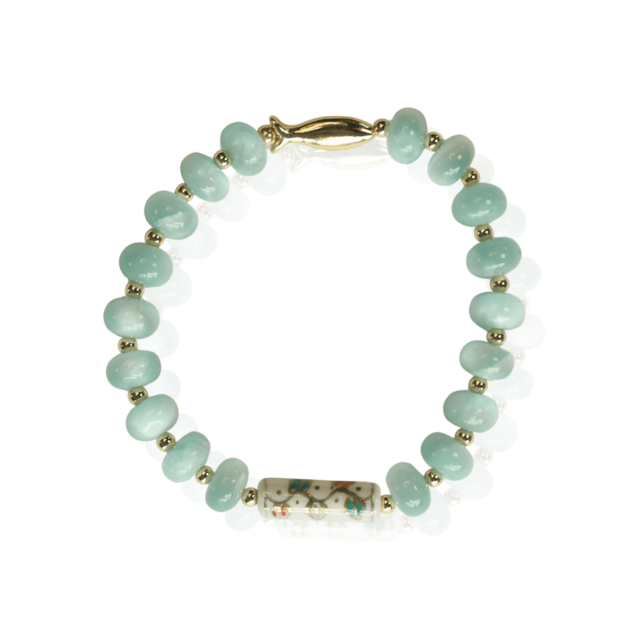 Soft shimmer, sea greens, and just the right touch of gold—this bracelet is all about balance. Made with calming green moonstone rondelle beads and alternating 14k gold-filled accents, it’s finished with a sleek gold fish bead and a hand-painted ceramic bead for that extra pop of personality. It’s easy to wear, totally stackable, and handmade to bring good vibes all day long.