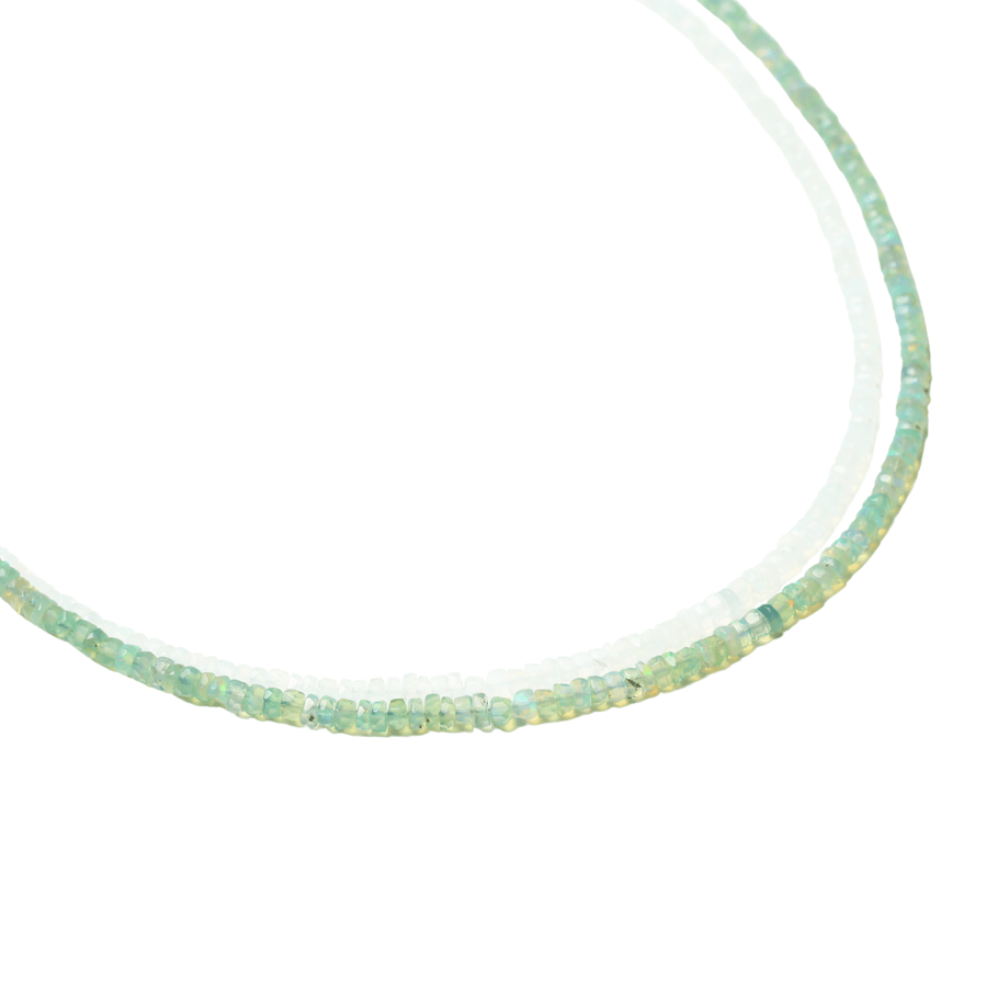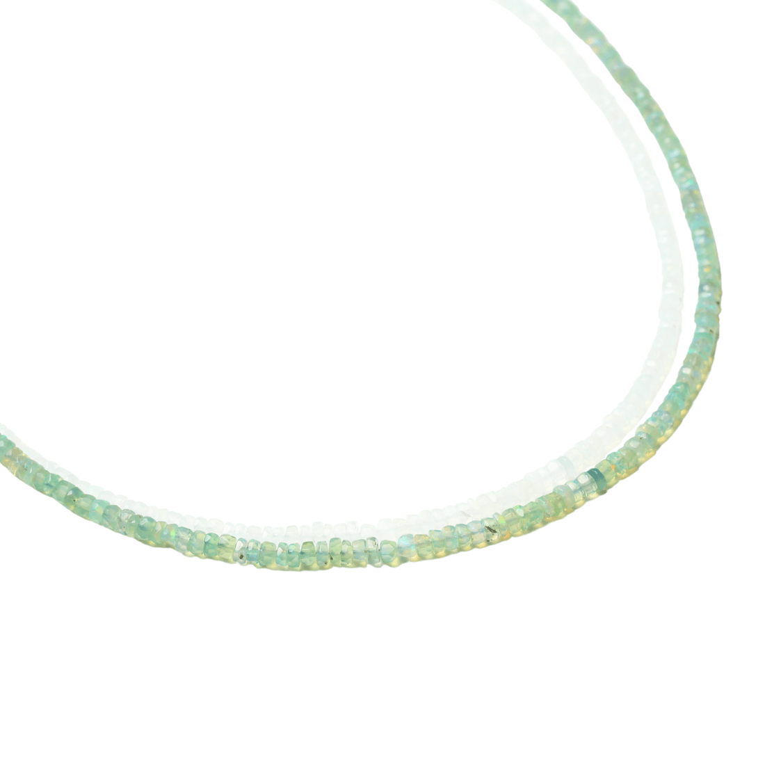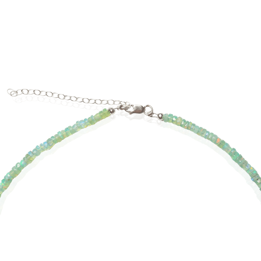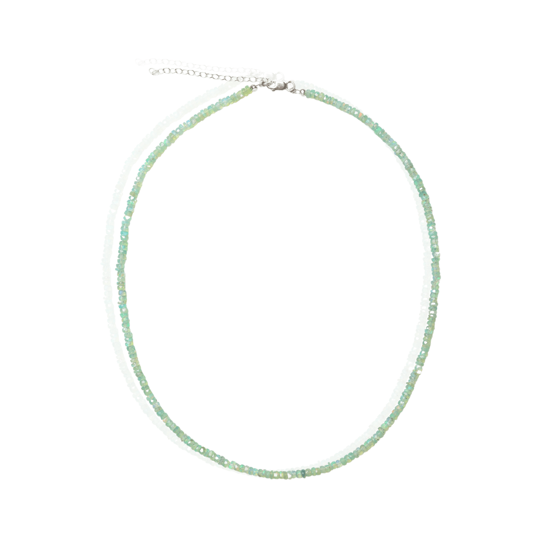 Shifting between soft seafoam and luminous teal, this Ethiopian opal necklace brings the colors of low tide and sunlit shallows right to your neckline. Made from 5mm faceted rondelle opals that catch the light with every move, it's finished with a sterling silver clasp and 2" extender for versatile styling.