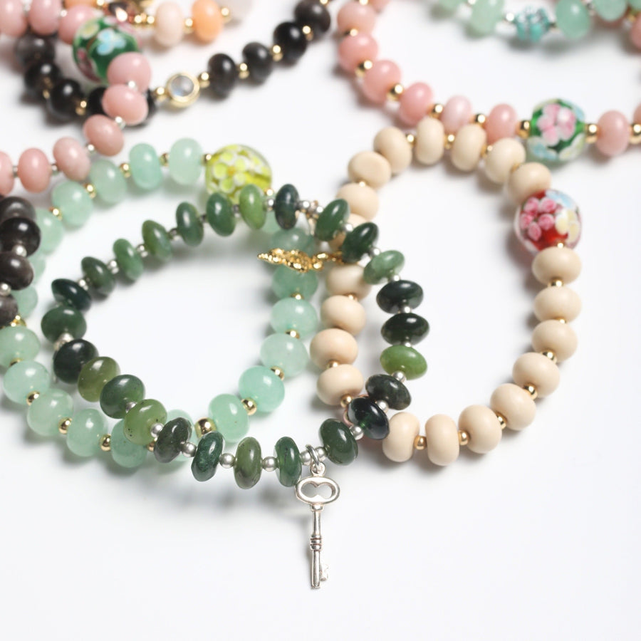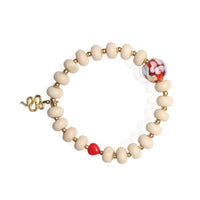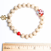 Rooted in earth tones with a flash of vintage romance, this stretchy bracelet channels quiet power and playful charm. Featuring 8mm round beige fossil jasper beads, a bold 90’s-style red floral glass bead, a fiery Czech glass heart, and a tiny 14kt gold fill snake charm—it’s grounded, a little rebellious, and totally unique. Measures 6.5” and fits most wrists with an easy stretch design.